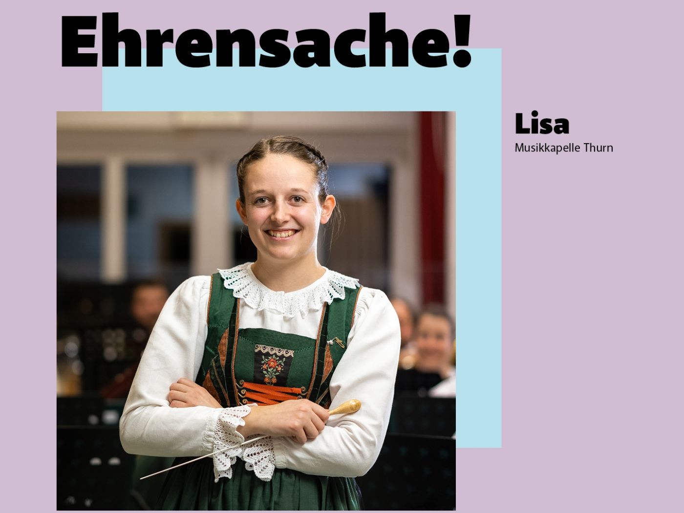 Lisa Steiger ist die Kapellmeisterin der Musikkapelle Thurn. Sie steht in der Kampagne des Landes Tirol für den Bereich „Tradition“ und ist eine von vielen Testimonials aus ganz Tirol, die für die Vielfalt an ehrenamtlichen Funktionen und Aufgaben stehen, wie z.B. auch aus den Bereichen Sicherheit, Nachbarschaftshilfe, Soziales, Jugend und Sport.