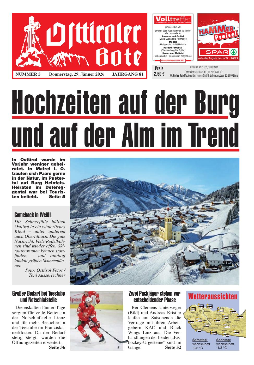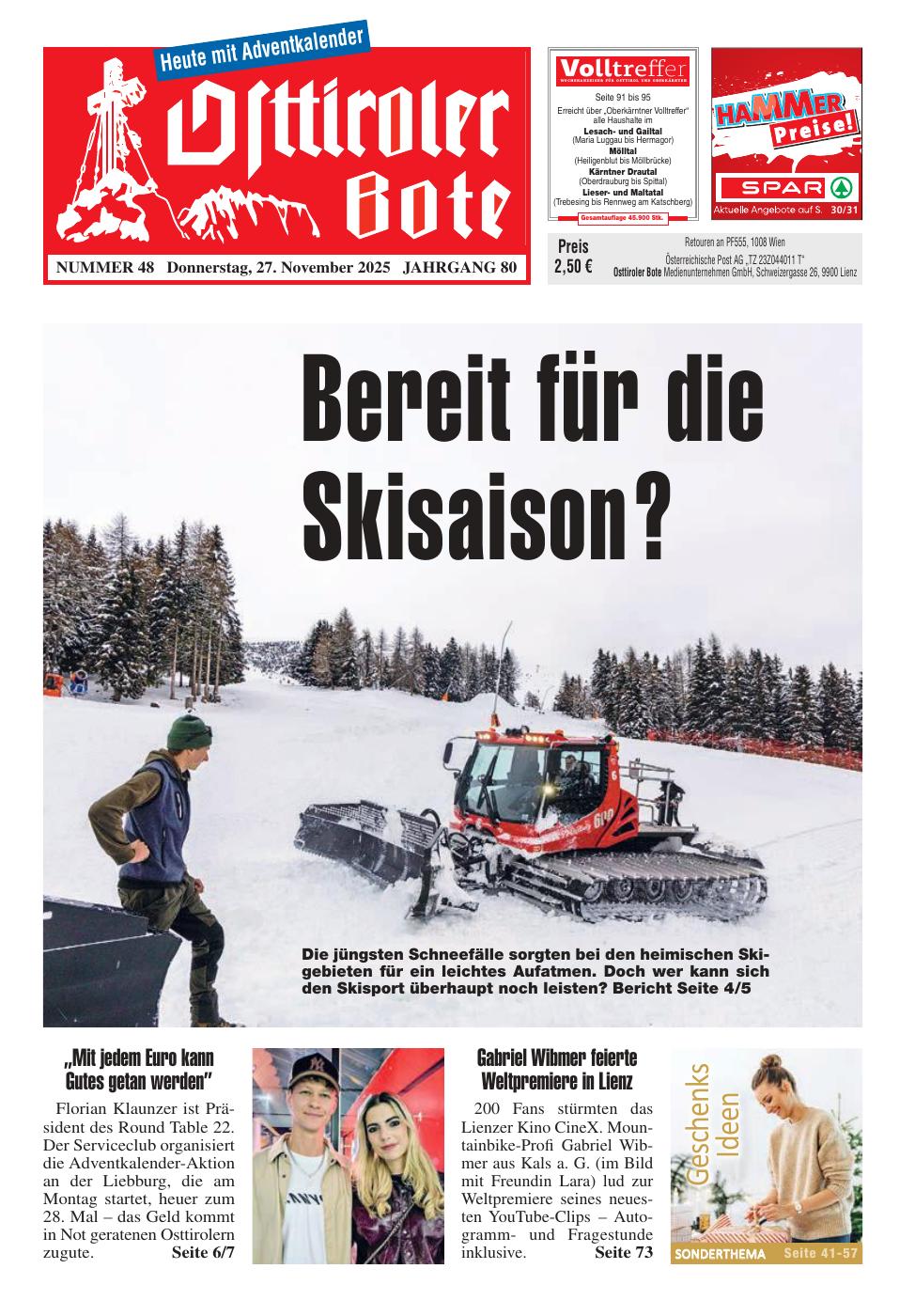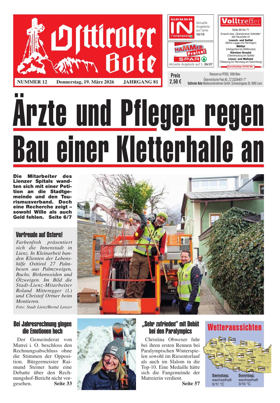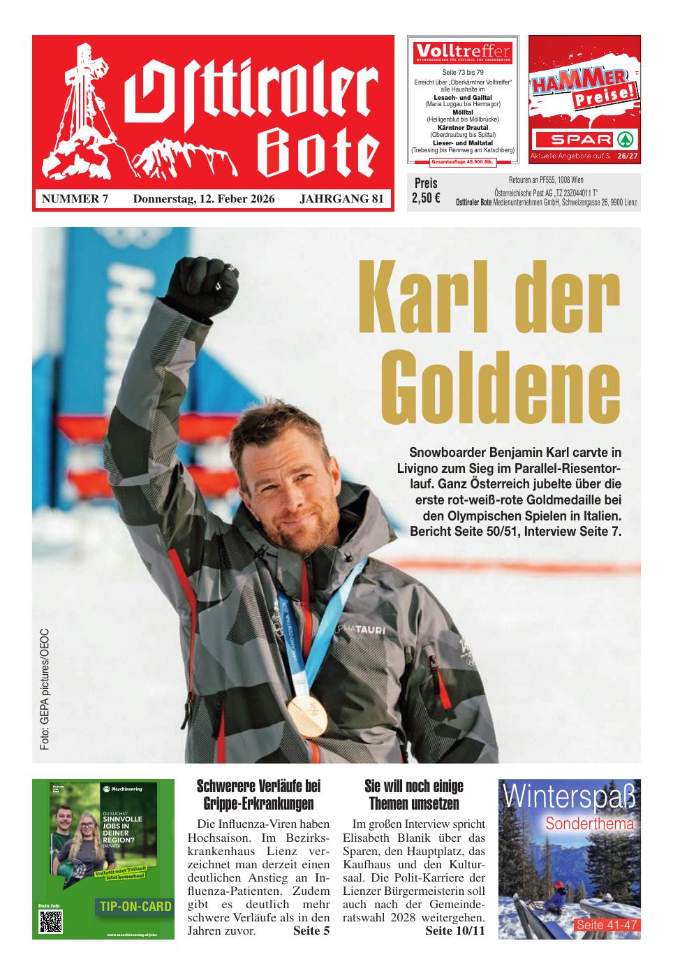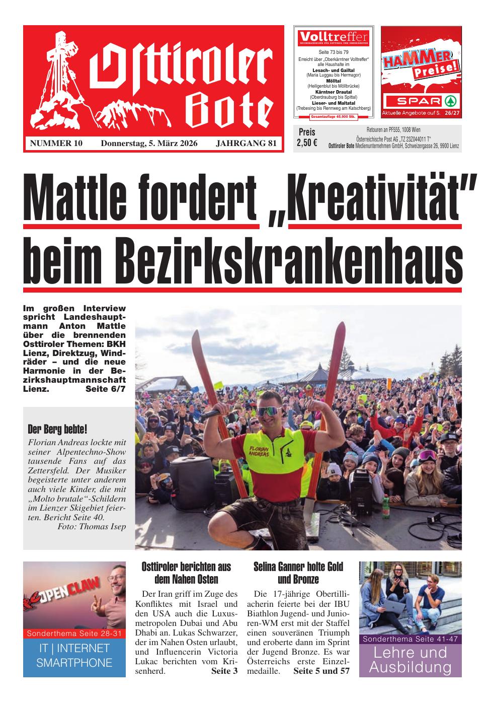 Erleben Sie die neuesten Nachrichten und Geschichten aus der Region – direkt im digitalen Zeitungsformat! Hier können Sie die aktuellsten Ausgaben von regionalen Zeitungen wie dem Osttiroler Bote und dem Oberkärntner Volltreffer online lesen und sich umfassend über das Geschehen vor Ort informieren. Bleiben Sie nah dran an den Themen, die unsere Region bewegen.