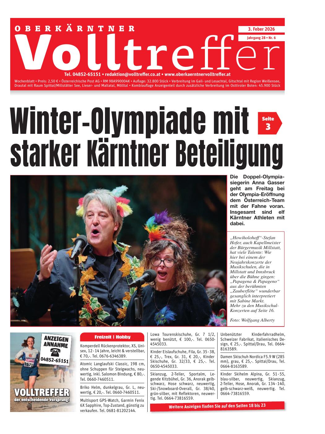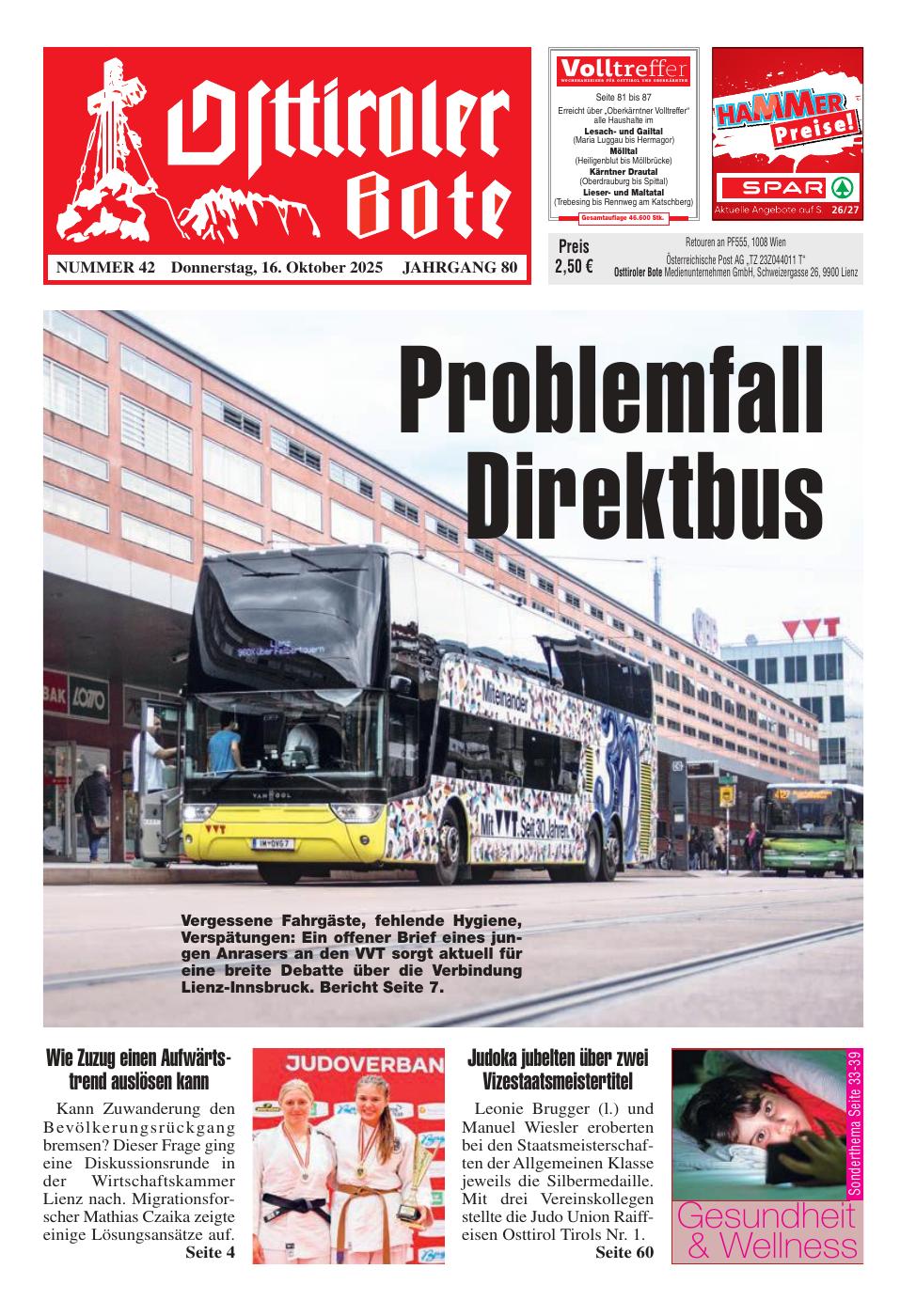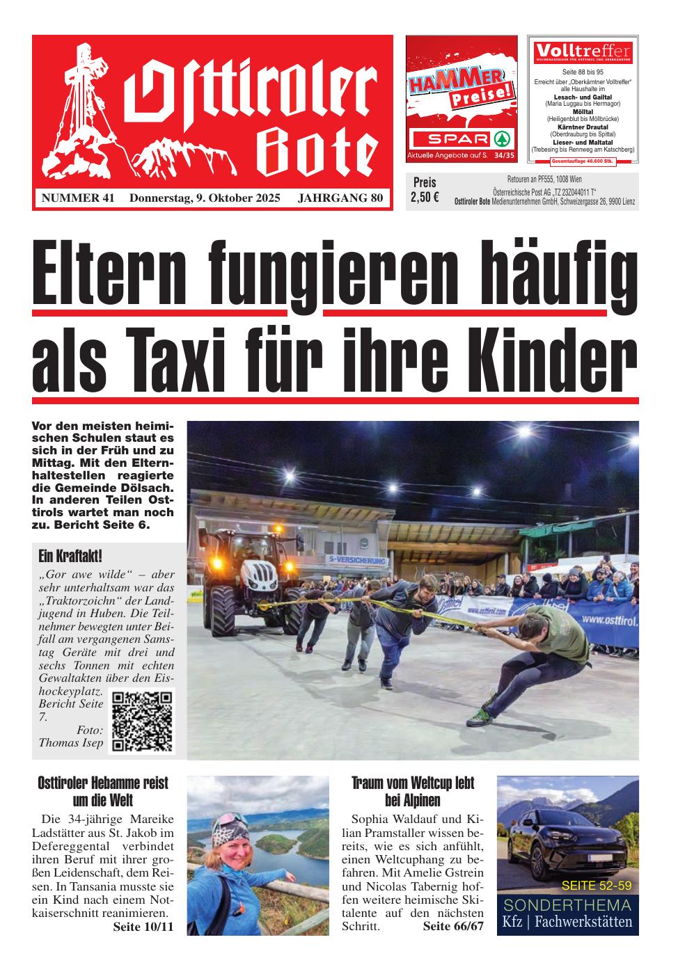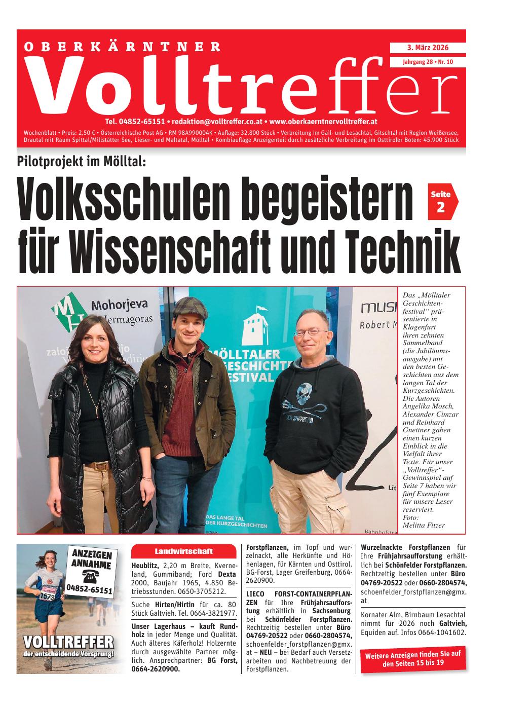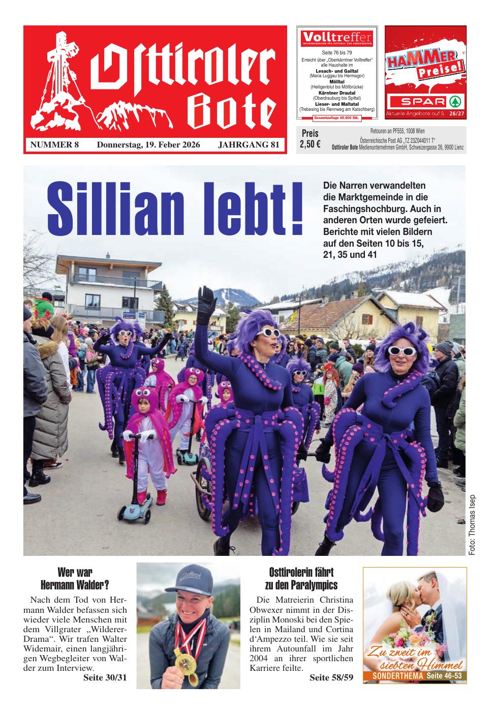 Erleben Sie die neuesten Nachrichten und Geschichten aus der Region – direkt im digitalen Zeitungsformat! Hier können Sie die aktuellsten Ausgaben von regionalen Zeitungen wie dem Osttiroler Bote und dem Oberkärntner Volltreffer online lesen und sich umfassend über das Geschehen vor Ort informieren. Bleiben Sie nah dran an den Themen, die unsere Region bewegen.