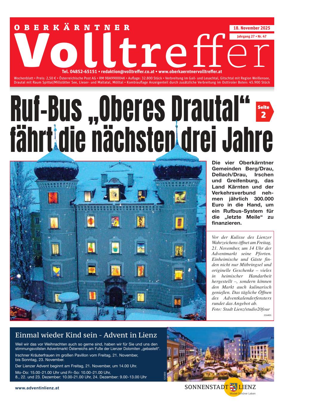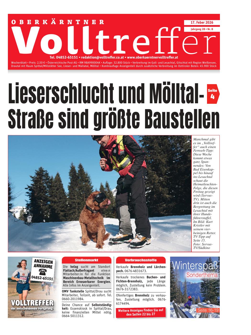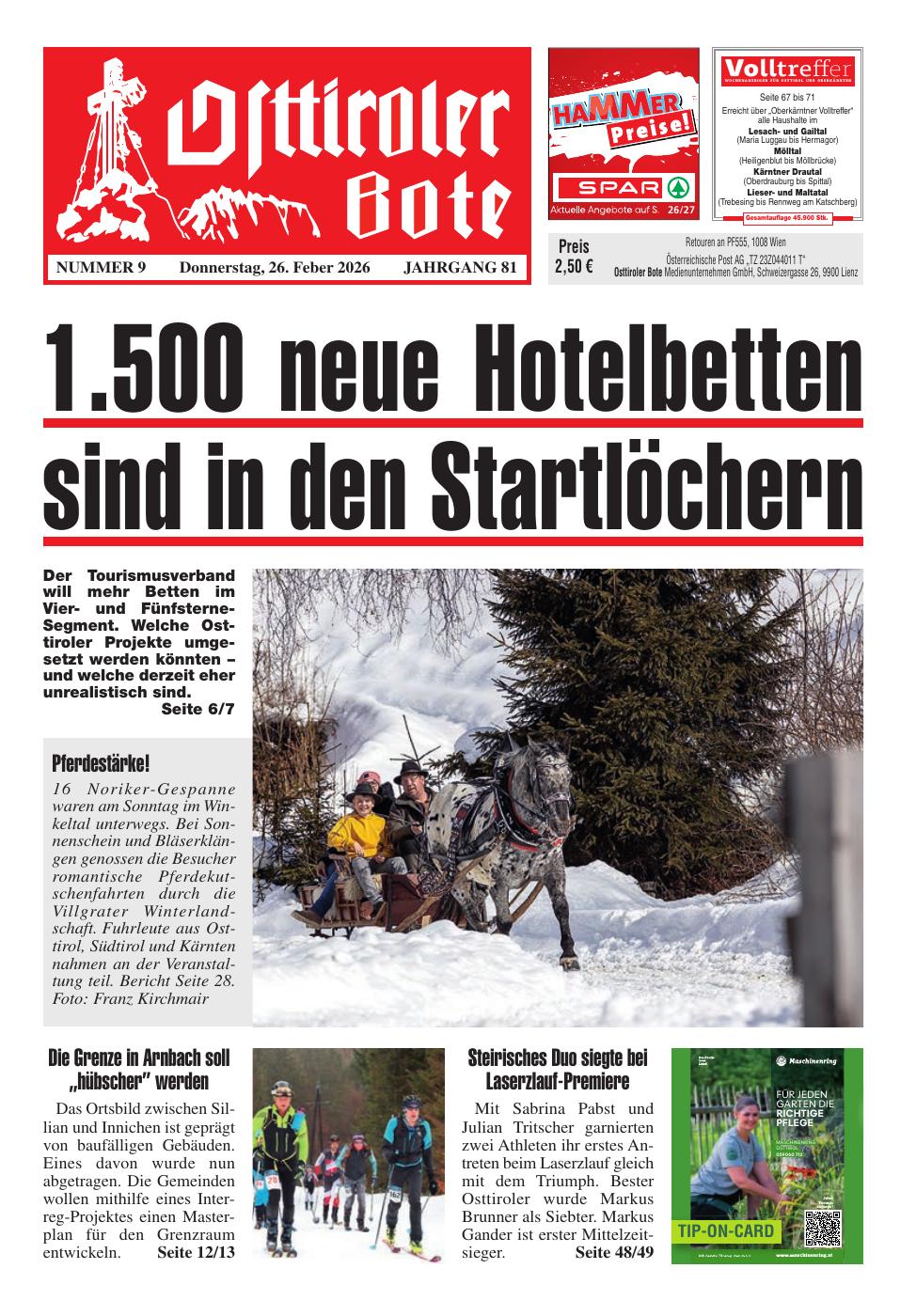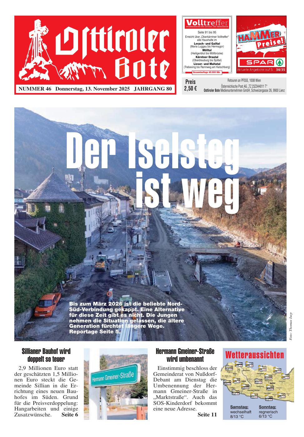 Erleben Sie die neuesten Nachrichten und Geschichten aus der Region – direkt im digitalen Zeitungsformat! Hier können Sie die aktuellsten Ausgaben von regionalen Zeitungen wie dem Osttiroler Bote und dem Oberkärntner Volltreffer online lesen und sich umfassend über das Geschehen vor Ort informieren. Bleiben Sie nah dran an den Themen, die unsere Region bewegen.