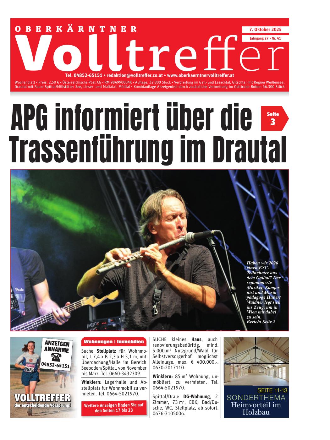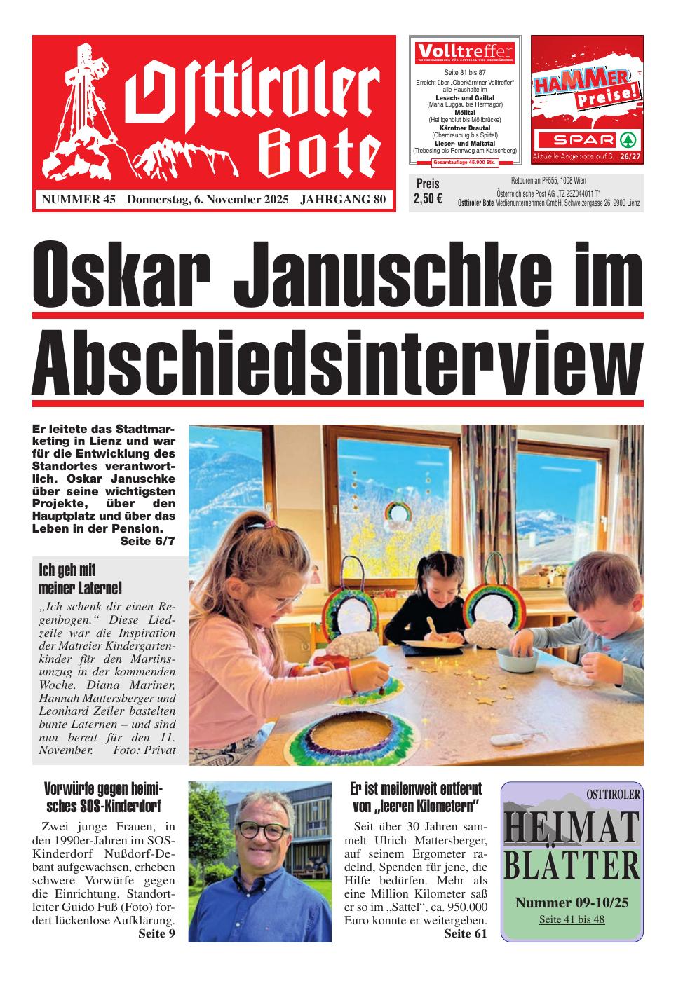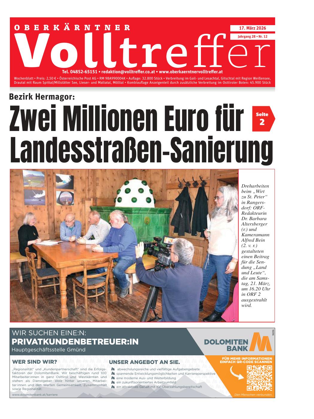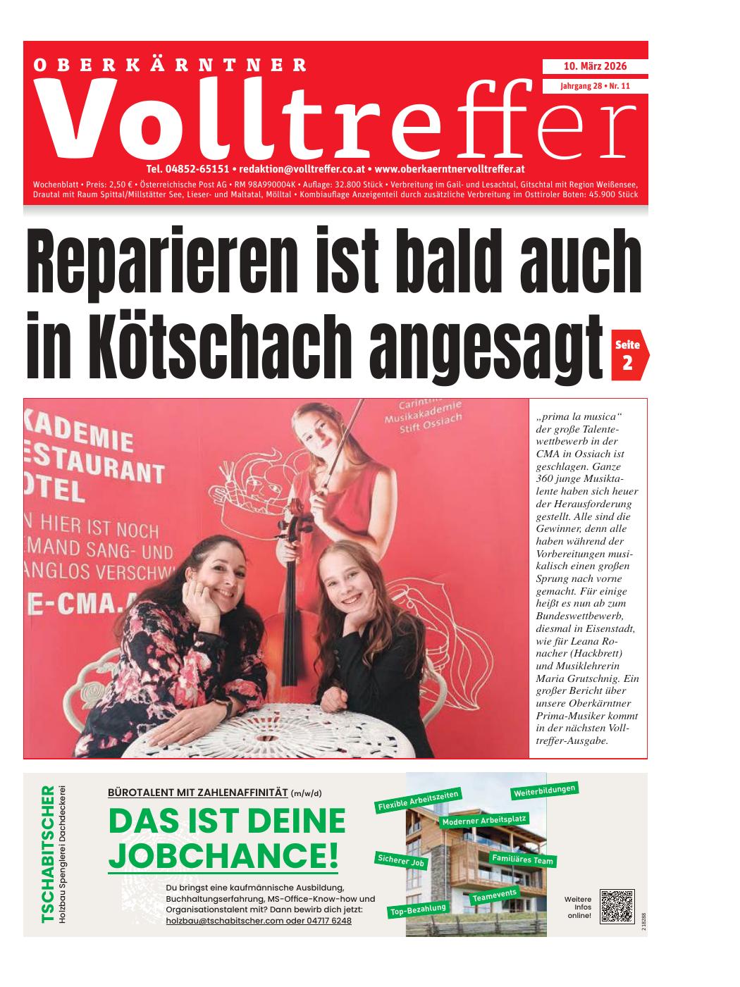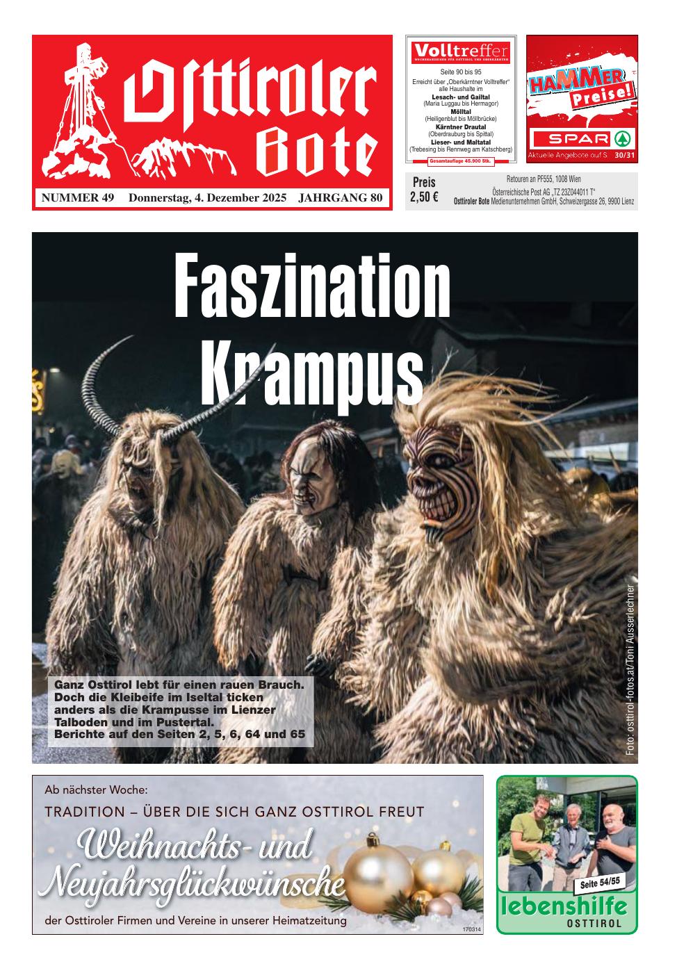 Erleben Sie die neuesten Nachrichten und Geschichten aus der Region – direkt im digitalen Zeitungsformat! Hier können Sie die aktuellsten Ausgaben von regionalen Zeitungen wie dem Osttiroler Bote und dem Oberkärntner Volltreffer online lesen und sich umfassend über das Geschehen vor Ort informieren. Bleiben Sie nah dran an den Themen, die unsere Region bewegen.