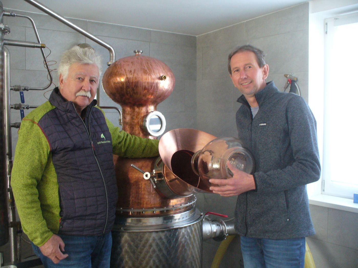 V. l.: Manfred Gartner und Engelbert Huber – so gehen sie am Schnapsbrennkessel zu Werke.